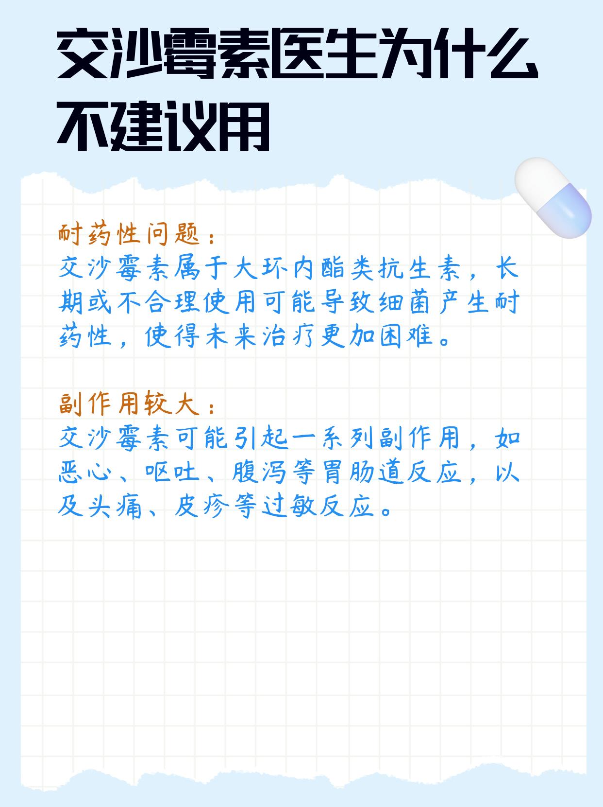 📌除此之外,我还告诉他,交沙霉素虽然是一种抗生素,但并非所有感染都适用。如果长期或不合理使用可能导致细菌产生耐药性以及引起一系列副作用。