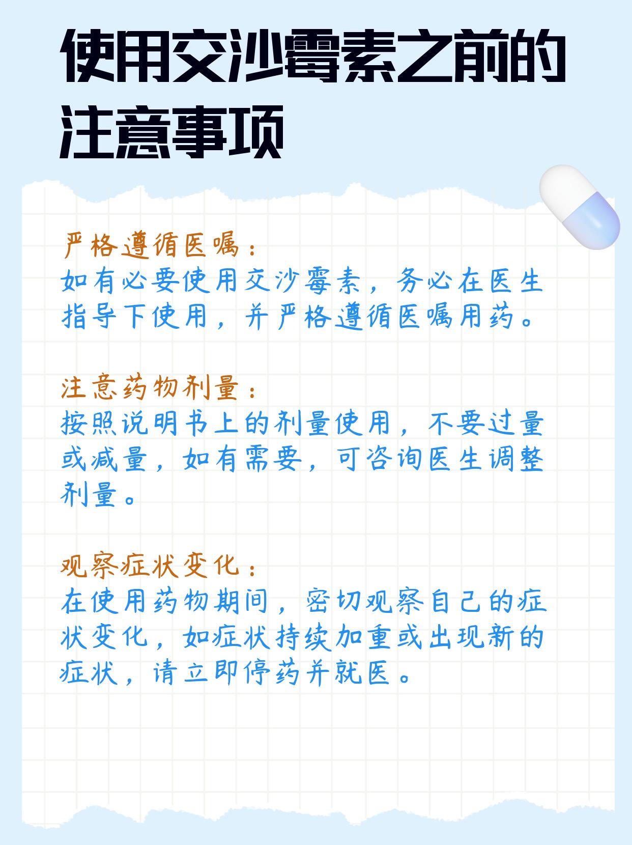 💡所以,在此我想提醒大家在使用交沙霉素之前,需要注意一些事项,比如严格遵循医嘱、注意药物剂量、观察症状变化等。