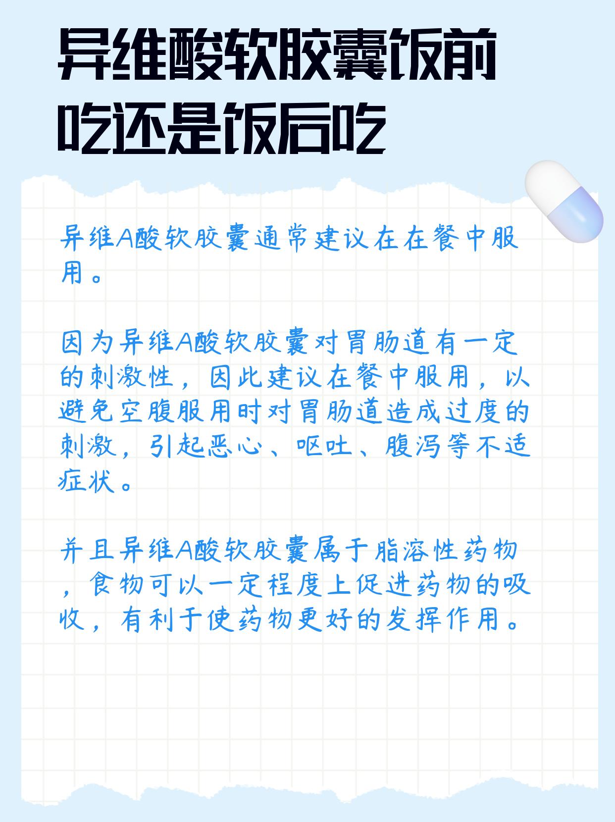 👨⚕️我告诉他,要在餐中服用异维A酸软胶囊,因为在这个时间点服用食物可以促进药物的吸收,有利于使药物更好的发挥作用。同时,餐中服用还可以减轻药物对胃肠道的刺激,降低不良反应的发生。