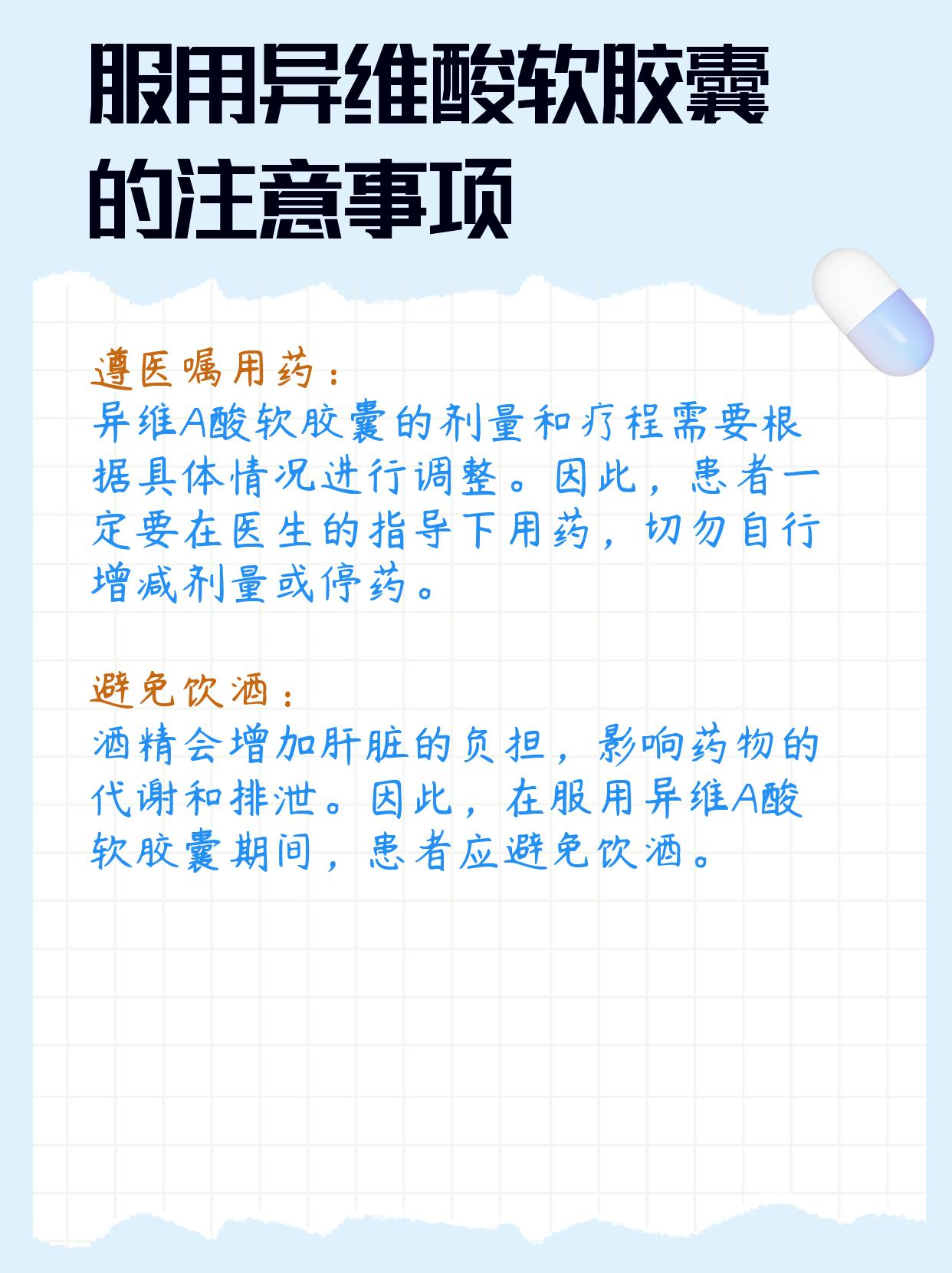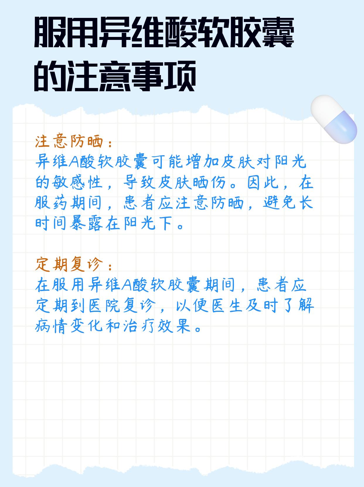 而且,在服用异维A酸软胶囊的时候也有一些事项需要注意,比如遵医嘱用药、避免饮酒、注意防晒、定期复诊等。
