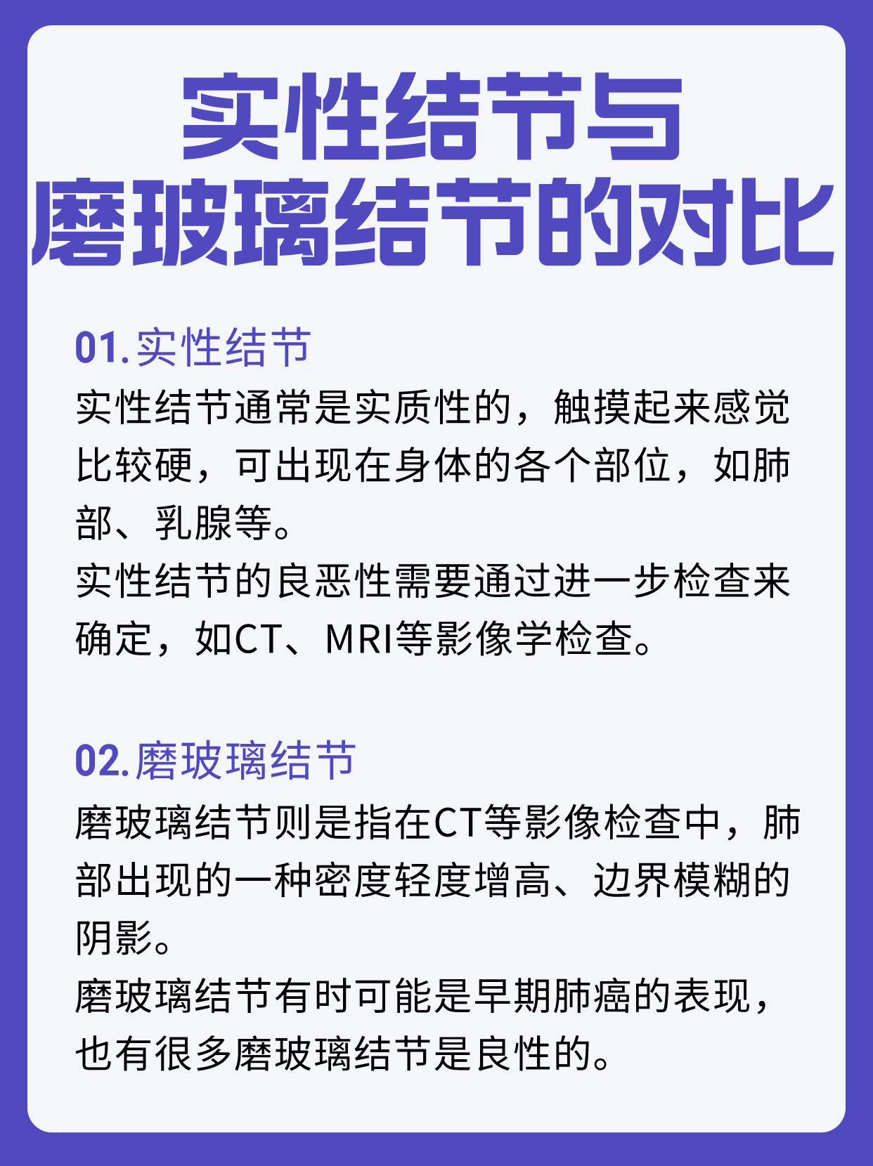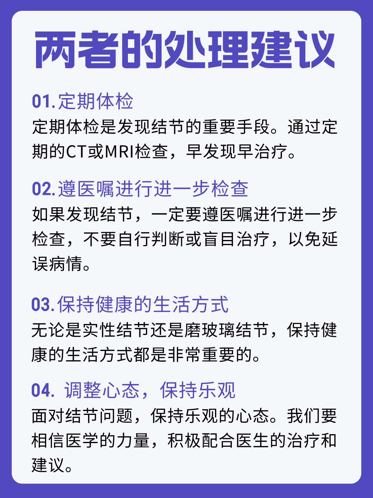 今天,我想和大家聊聊实性结节和磨玻璃结节这两种常见的结节类型,帮助大家更好地了解它们,并给出一些处理建议,具体内容我已经放在图中啦,记得看哦!