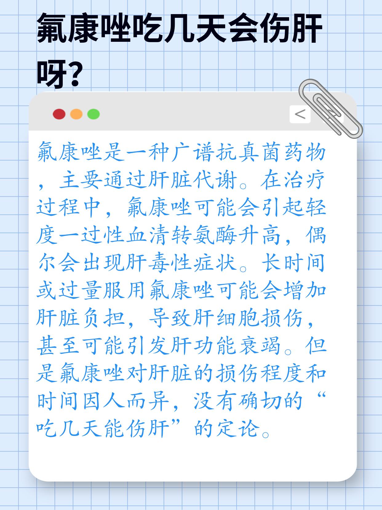 我告诉他说,身体健康的话,短时间服用氟康唑通常不会对肝脏造成明显损伤。如果需要长期服用氟康唑,建议定期进行肝功能检查,以便及时发现并处理可能出现的肝脏问题。