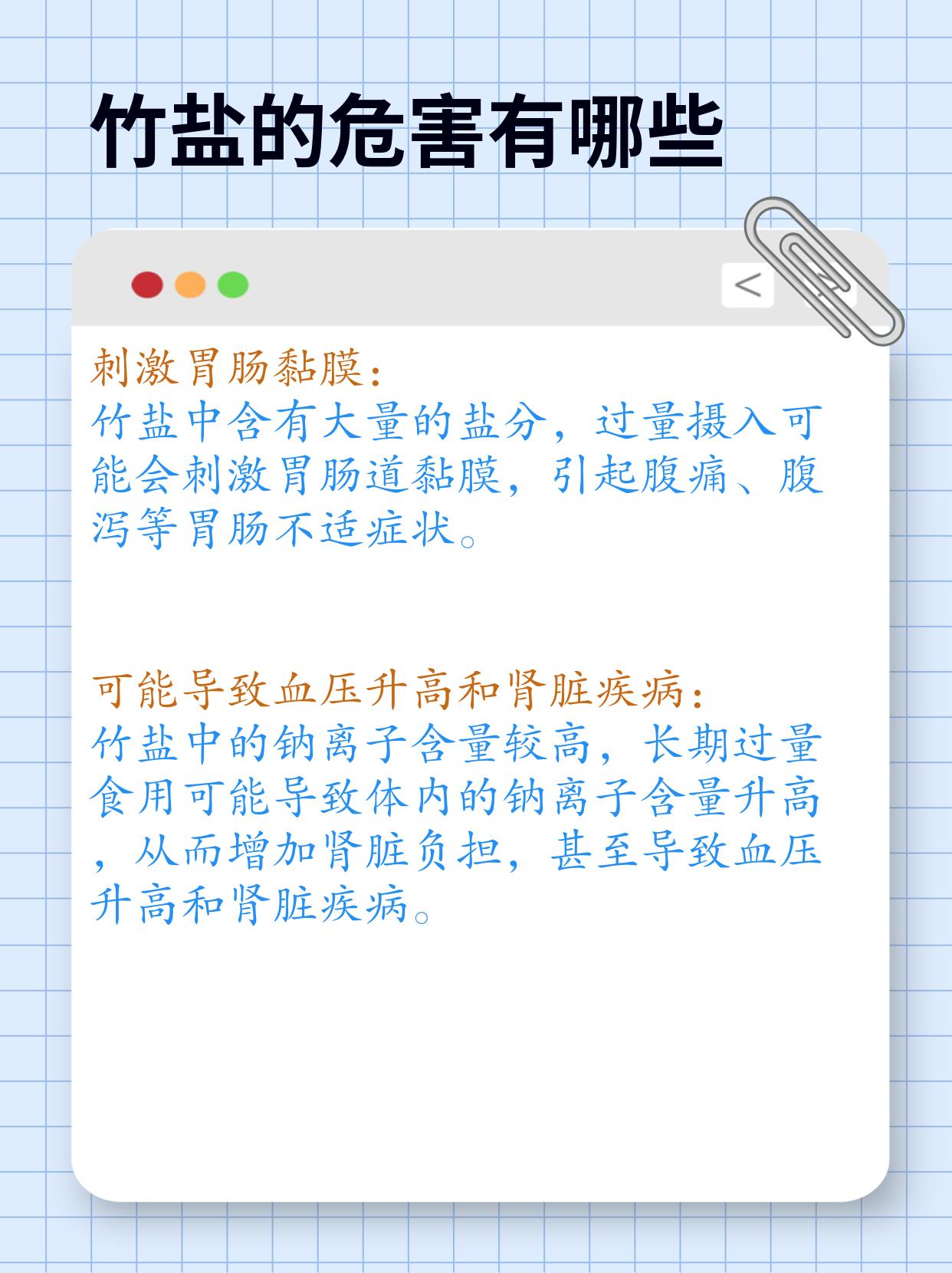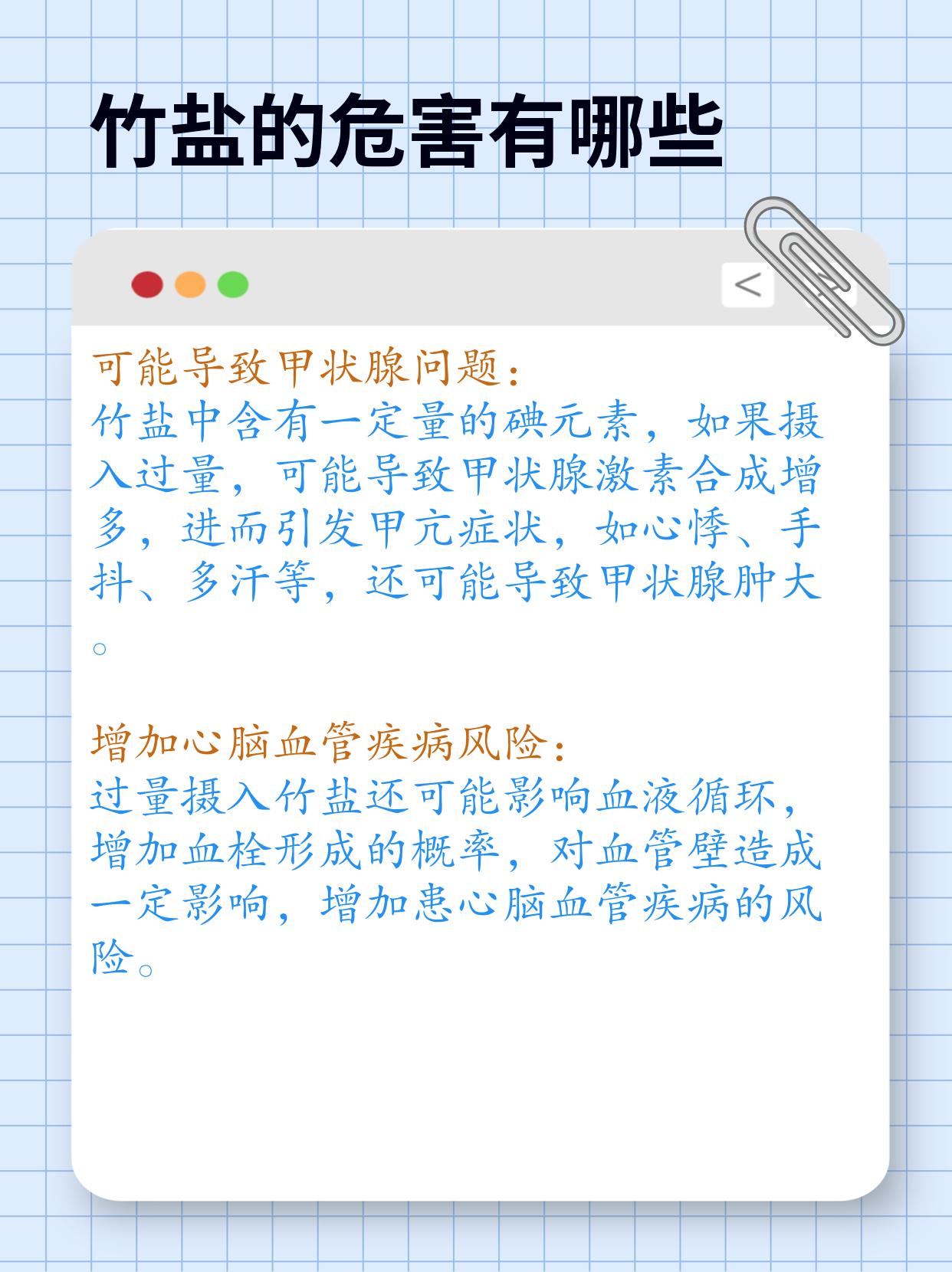 👀我告诉他,如果过量食用竹盐,可能会引发一系列健康问题,如刺激胃肠黏膜、可能导致血压升高和肾脏疾病、可能导致甲状腺问题、增加心脑血管疾病风险。