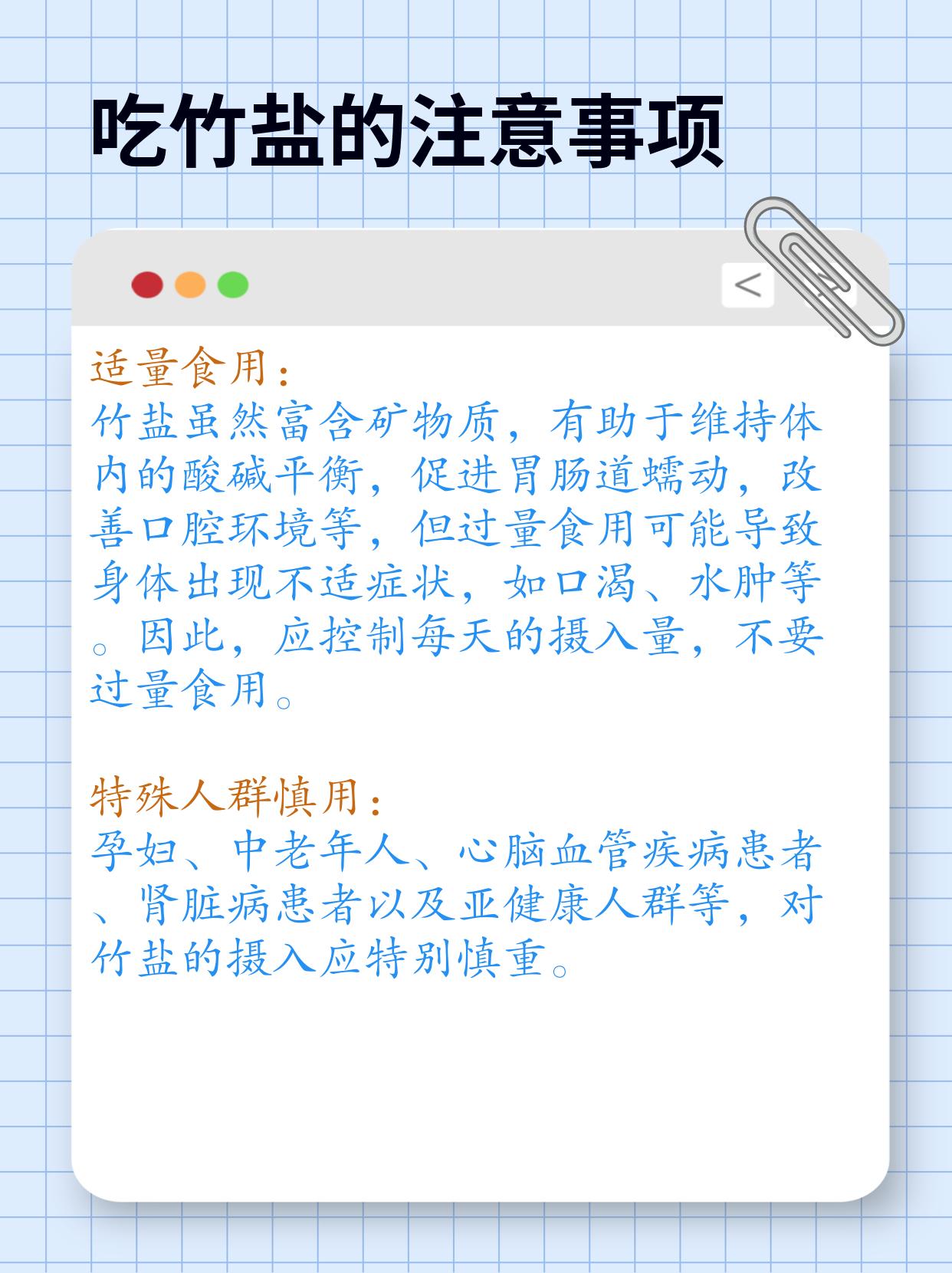🎯吃竹盐的时候要注意适量食用、特殊人群慎用。