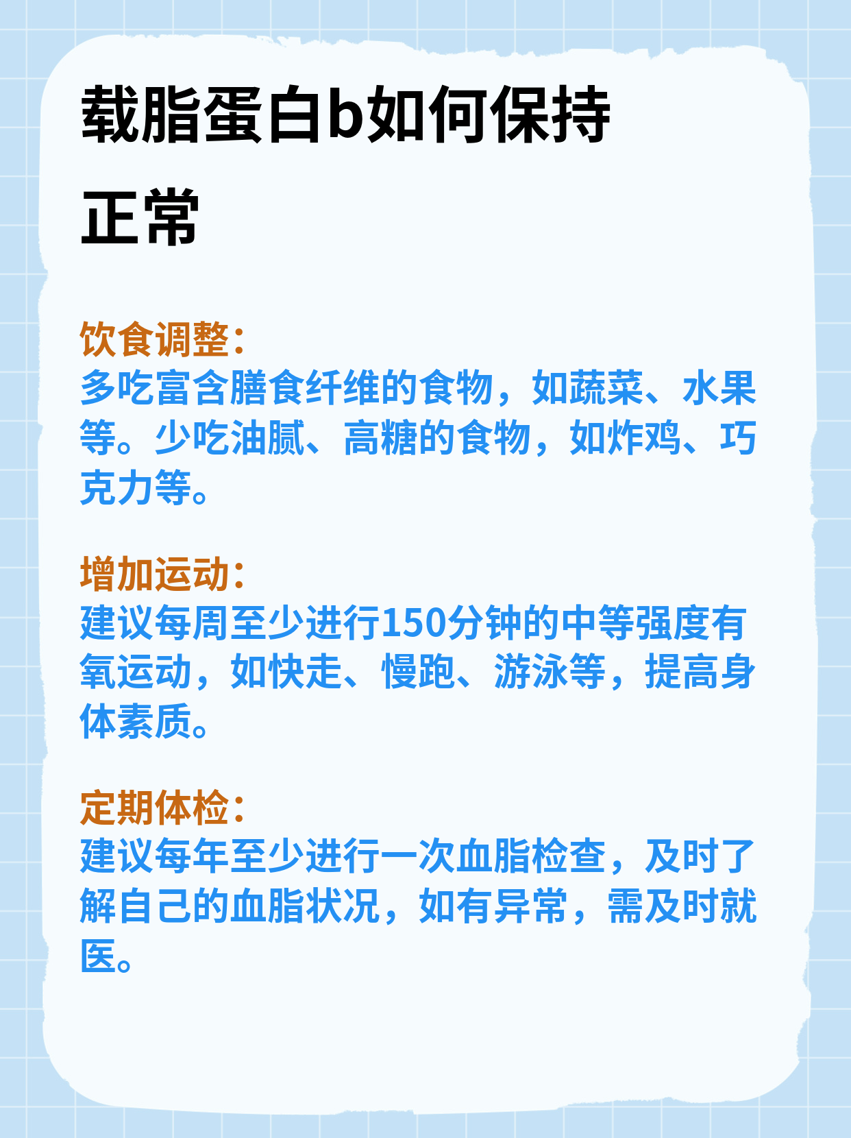 💡想要将载脂蛋白b维持在正常水平,可以采取饮食调整🍚、增加运动、定期体检等措施。