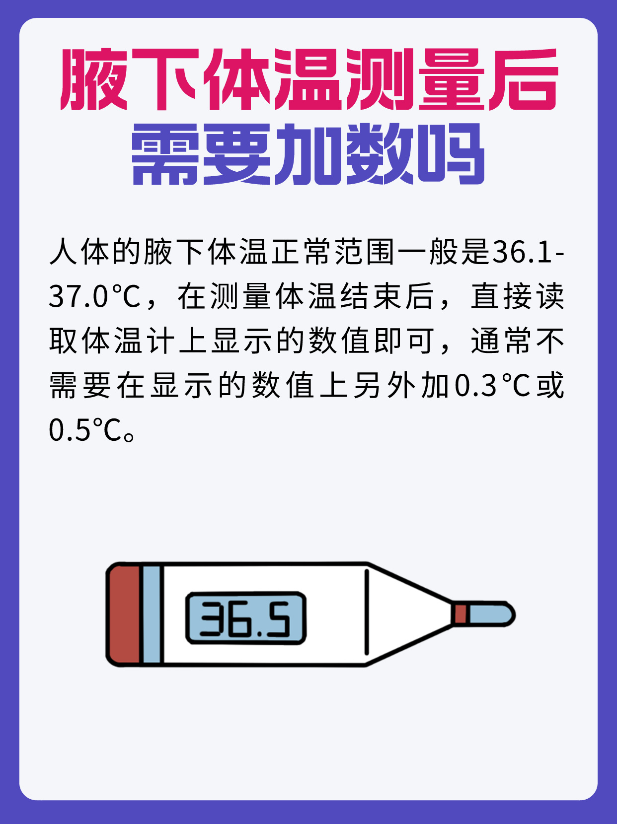 前几天,一位女性因为喉咙疼痛、感觉身体有点发热☹️前来就诊。我建议她测量体温,这位女性选择使用腋下体温计进行测量,测量结束后,她询问我:“医生,腋下体温测量后需要加0.3℃还是0.5℃❔”。