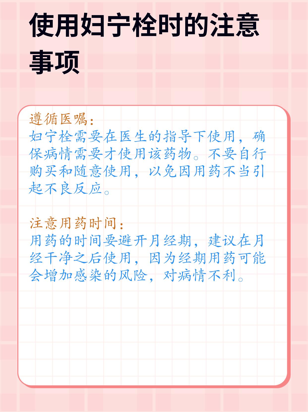 💬在使用妇宁栓的过程中,我也告诉了她一些需要注意的事项:遵循医嘱、注意用药时间、正确用药、注意卫生。