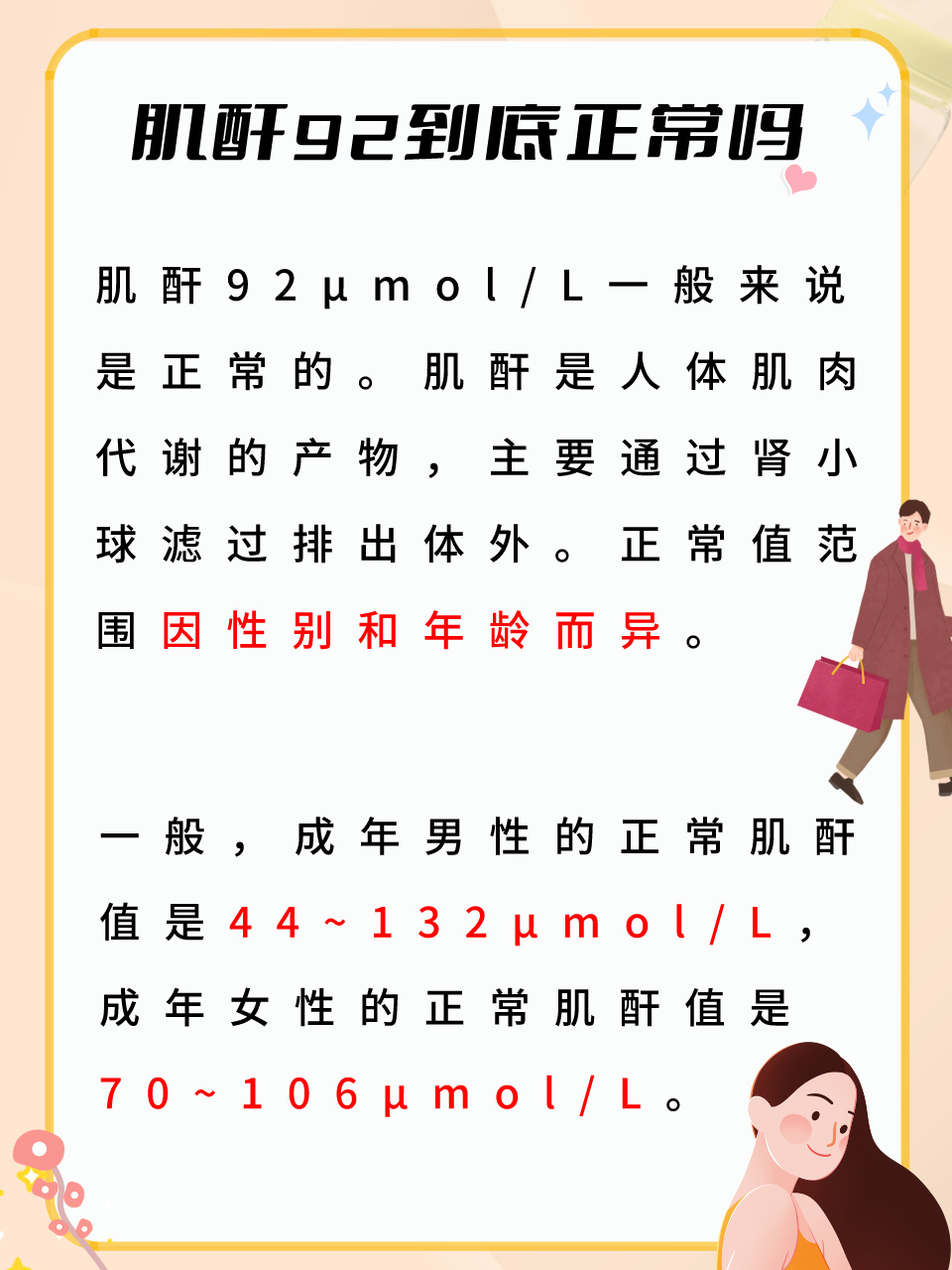 1肌酐92μmol/L一般来说是正常的。肌酐是人体肌肉代谢的产物,主要通过肾小球滤过排出体外。肌酐的正常值范围因性别和年龄而异。一般,成年男性的正常肌酐值是44~132μmol/L,成年女性的正常肌酐值是70~106μmol/L。因此,肌酐92μmol/L在正常范围内,属于正常水平。