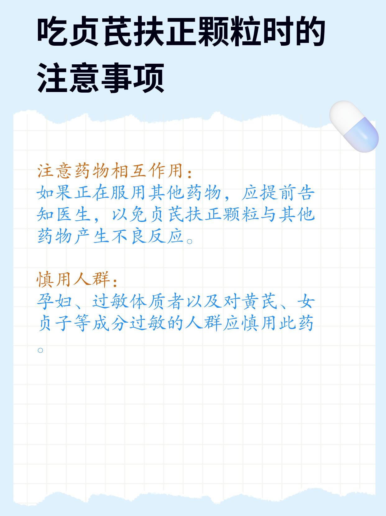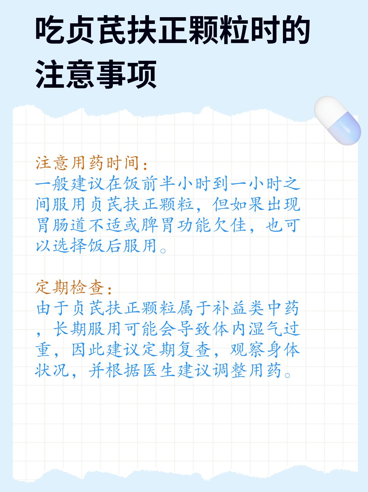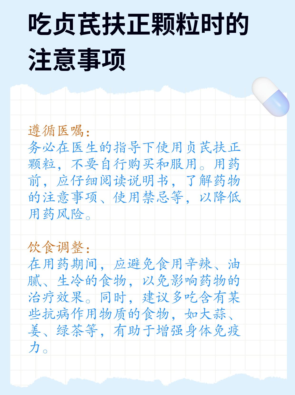 另外我还告诉他吃贞芪扶正颗粒时的注意事项,包括遵循医嘱、饮食调整、注意药物相互作用、慎用人群、注意用药时间、定期检查。