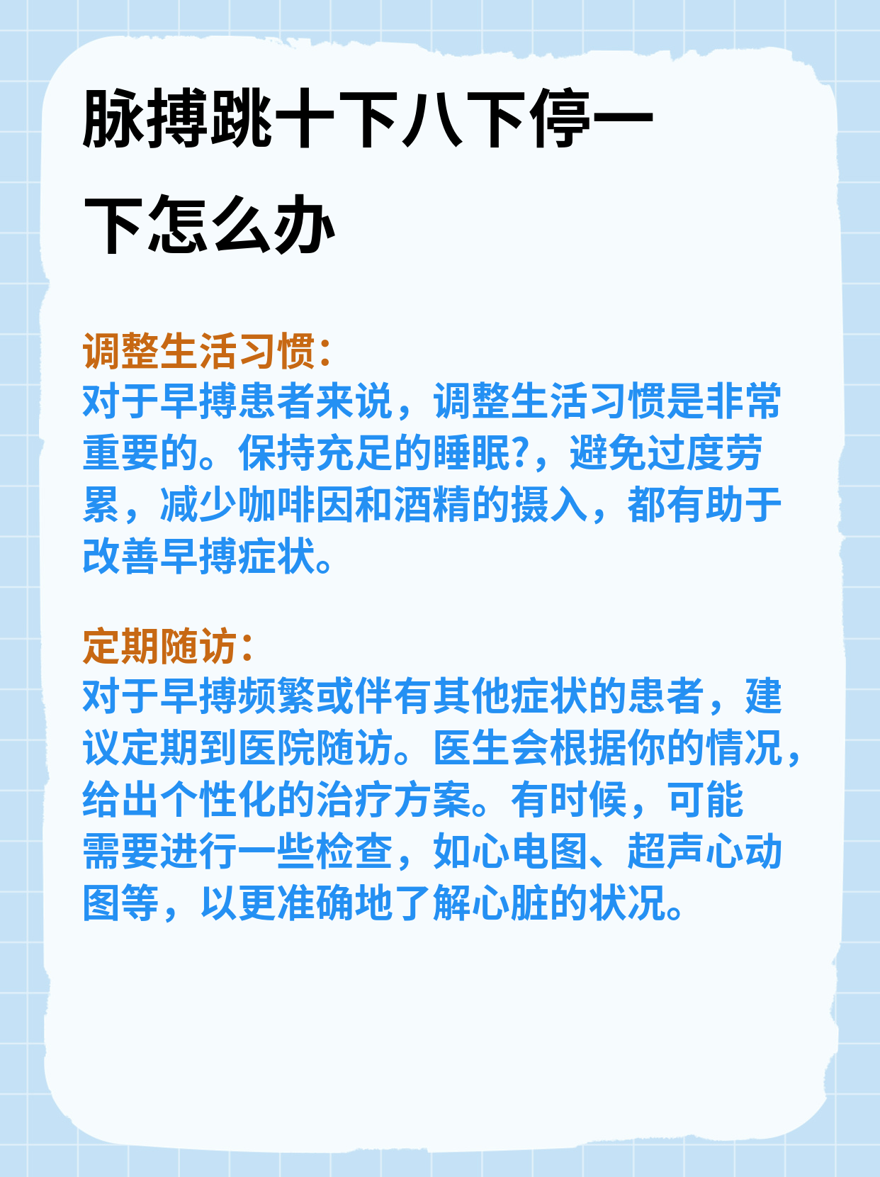 💖总的来说,脉搏跳得不规律并不一定意味着身体出了大问题。但也不能掉以轻心,应该及时咨询医生👨⚕️,了解原因并采取相应的处理措施。同时,保持良好的生活习惯和心态💪,也是预防这种情况的重要方法。