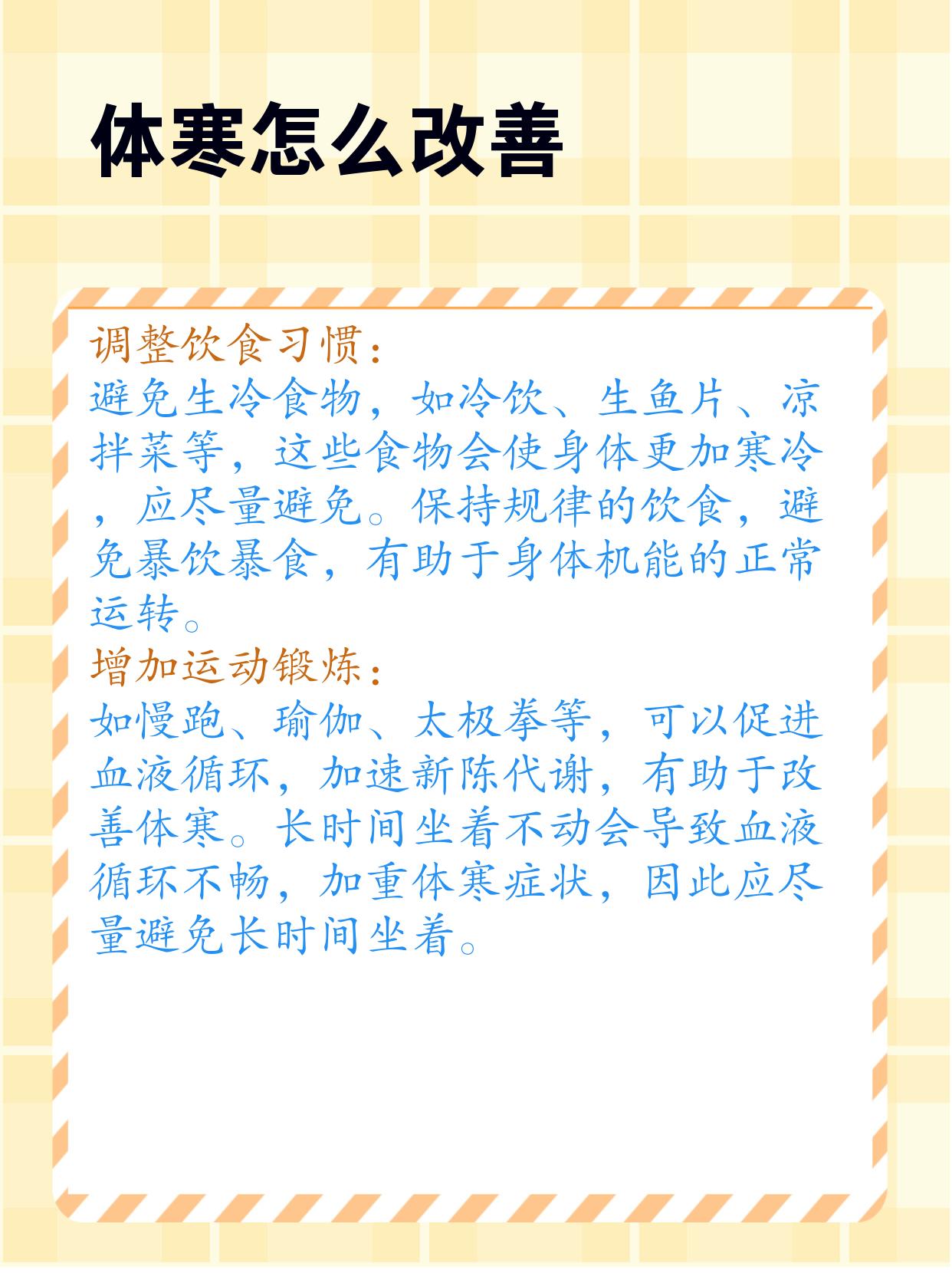 👉然后,我又跟她说了几点怎么改善体寒的方法,比如调整饮食习惯,增加运动锻炼等🥤。💪还有,适当运动也是很有必要的,能促进血液循环,帮助改善体寒。