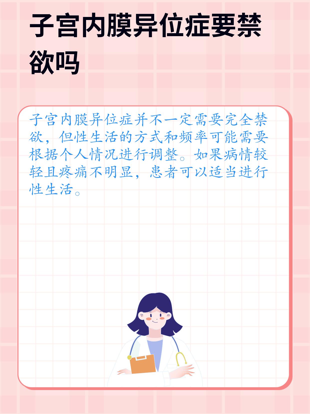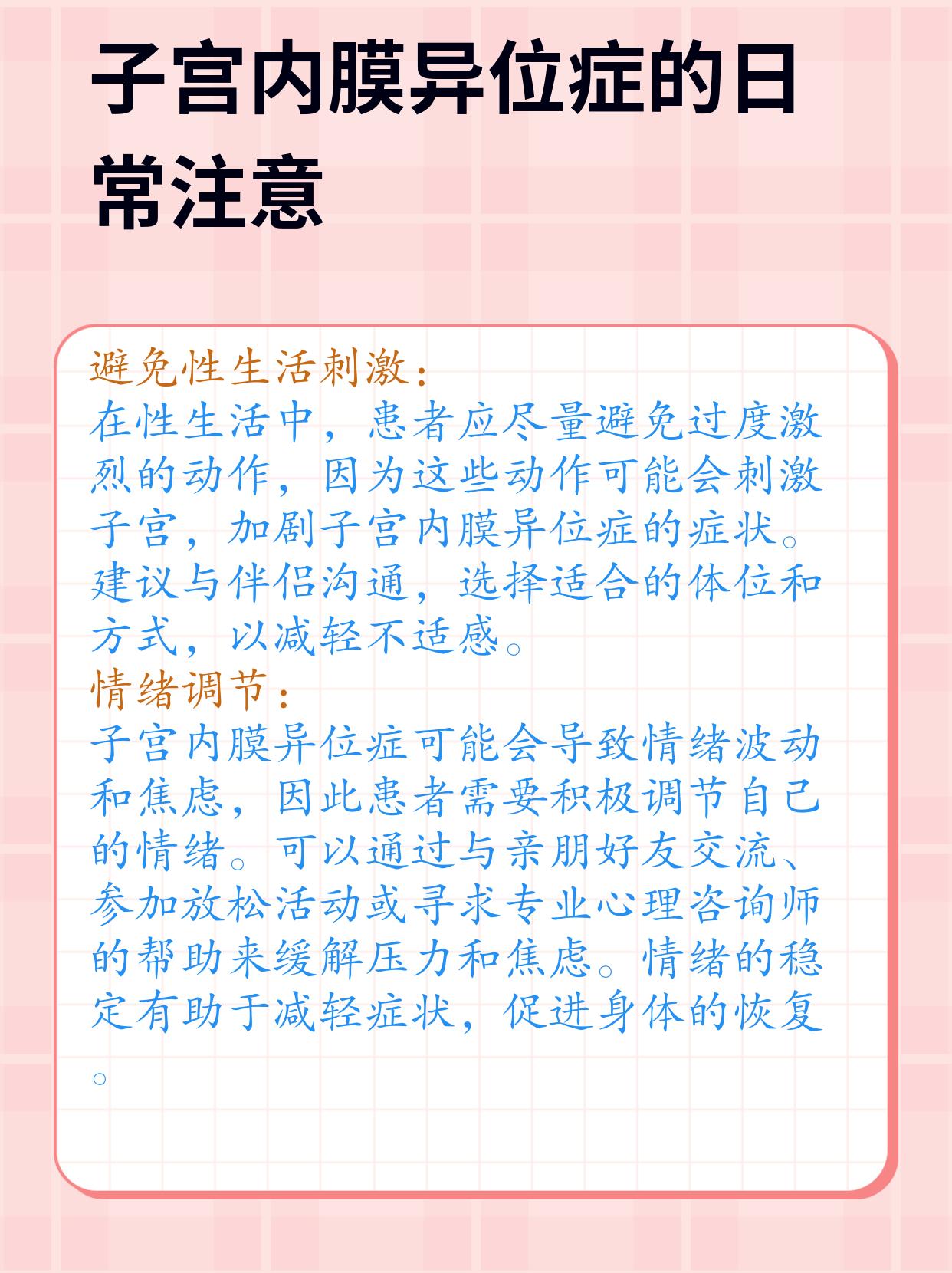 在日常的网上咨询中,经常会遇到患者询问关于子宫内膜异位症的各种问题,其中一个比较常见的就是“得了子宫内膜异位症要不要禁欲”😳。今天就来和大家详细说一说这个问题,以及子宫内膜异位症患者在日常生活中需要注意的一些事项📋。