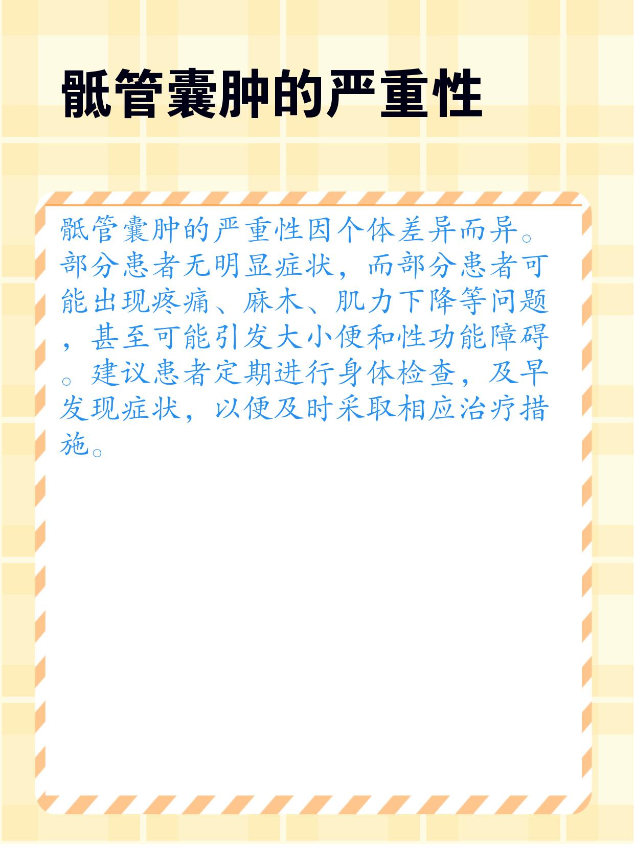 骶管囊肿的严重性因人而异。一些患者可能没有明显症状,而另一些患者可能会出现疼痛😣、麻木、肌力下降等问题,甚至可能导致大小便和性功能障碍🥺。