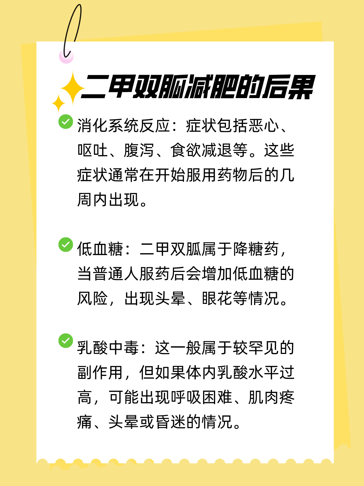 二甲双胍减肥的后果🔍二甲双胍是治疗 2 型糖尿病的药物之一,但具体的使用方法和剂量应根据医生的建议和个体情况来确定同时,使用二甲双胍可能会有一些副作用,如💡消化系统反应💡低血糖💡乳酸中毒等,在用药过程中需要注意观察。