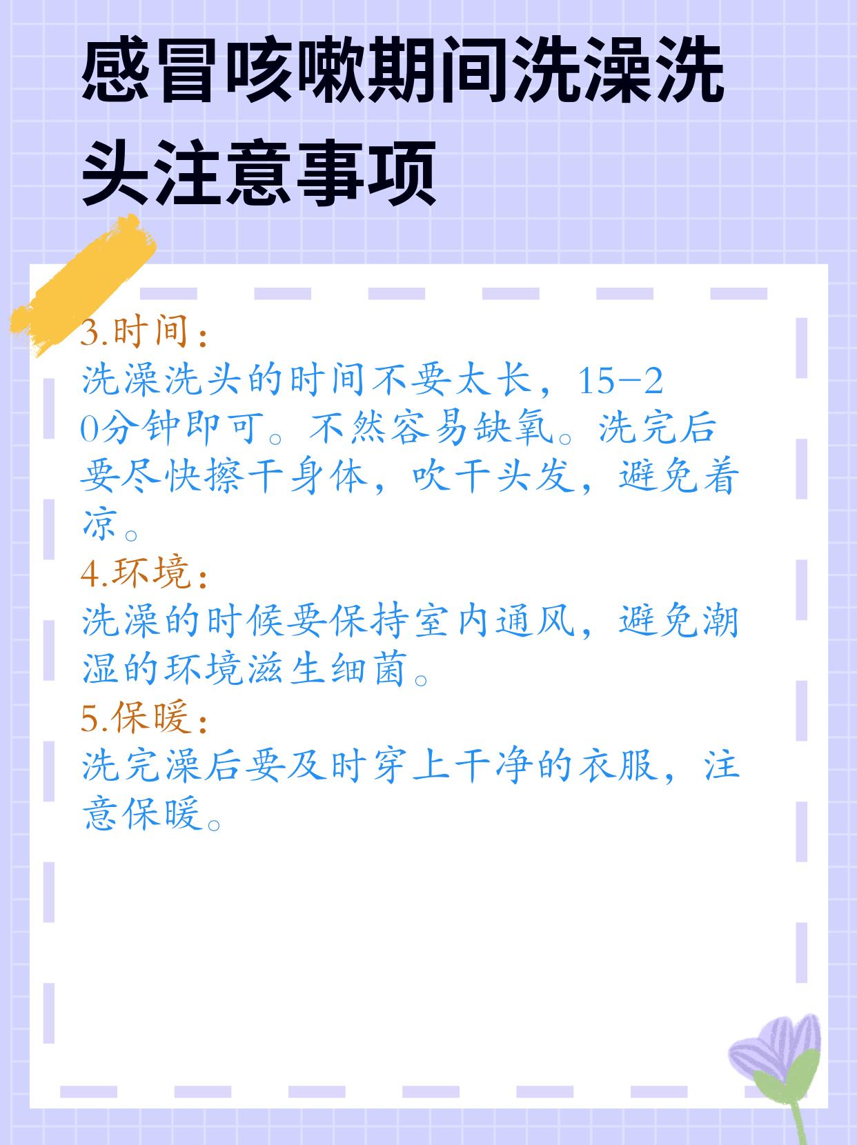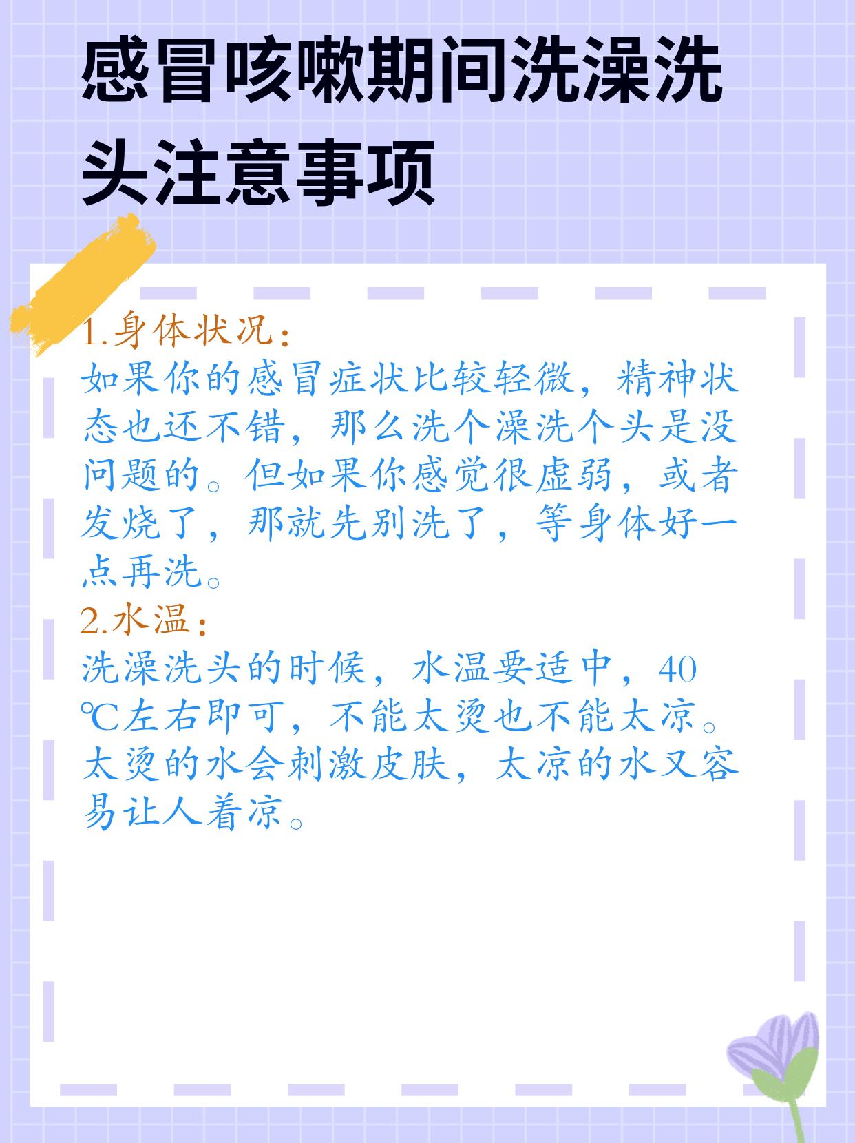 我笑了笑,告诉他:“其实,感冒咳嗽的症状比较轻的时候,是可以洗头洗澡的,只要注意一些细节就行👇,但是症状比较严重的时候,是不建议洗的。”