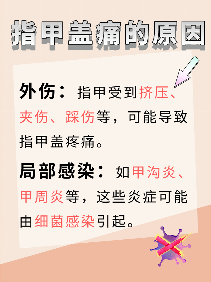 ①首先呢,我们来了解一下这疼痛背后的“幕后黑手”。很有可能是指甲下感染了细菌,或者是受到了什么外伤,让指甲盖变得如此敏感。别担心,鱼石脂软膏、夫西地酸乳膏等等的药物,帮您缓解疼痛,让指甲盖恢复往日的平静。↔️