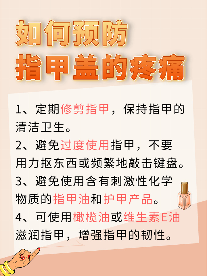 除了上述的预防措施外啊,还可以试试用橄榄油或维生素E油涂抹指甲,还能够滋润指甲,增强指甲的韧性呢。还有啊,多吃一些富含钙质和蛋白质的食物,也能帮助指甲健康成长哦!🧐