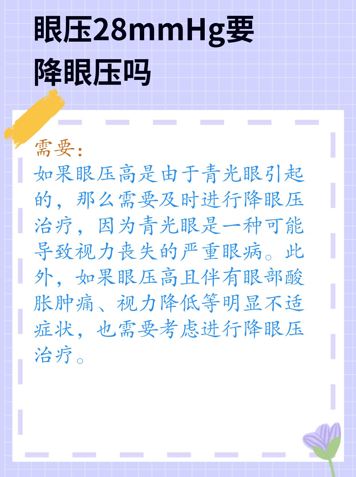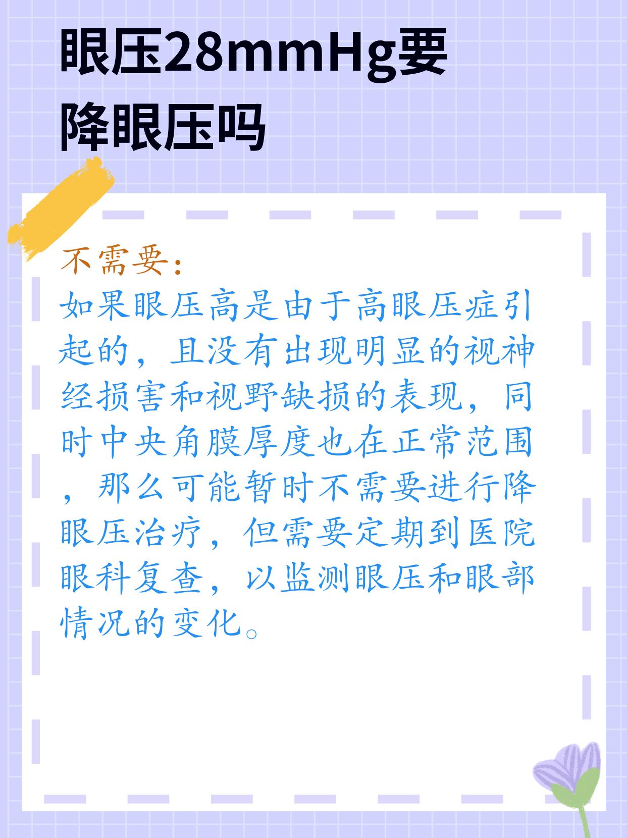 🌸眼压28mmHg是否需要降眼压需要根据具体情况来判断。如果眼压高且存在明显的眼部异常或不适症状,建议及时前往医院眼科接受专业检查和治疗。