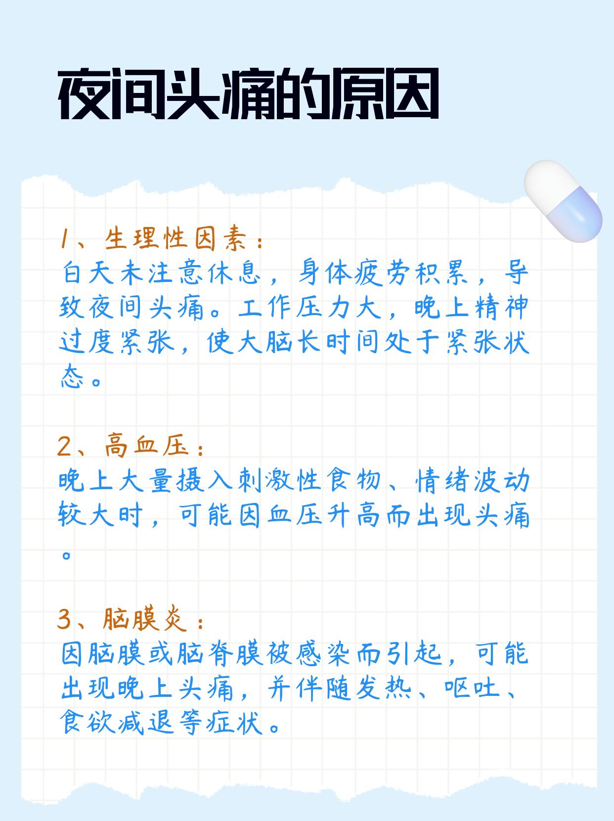 📢我告诉他生理性因素、高血压、脑膜炎都可能导致夜间头痛的发作。患者连忙告诉我,他有高血压病史🌟。