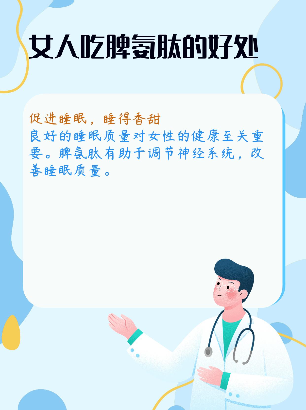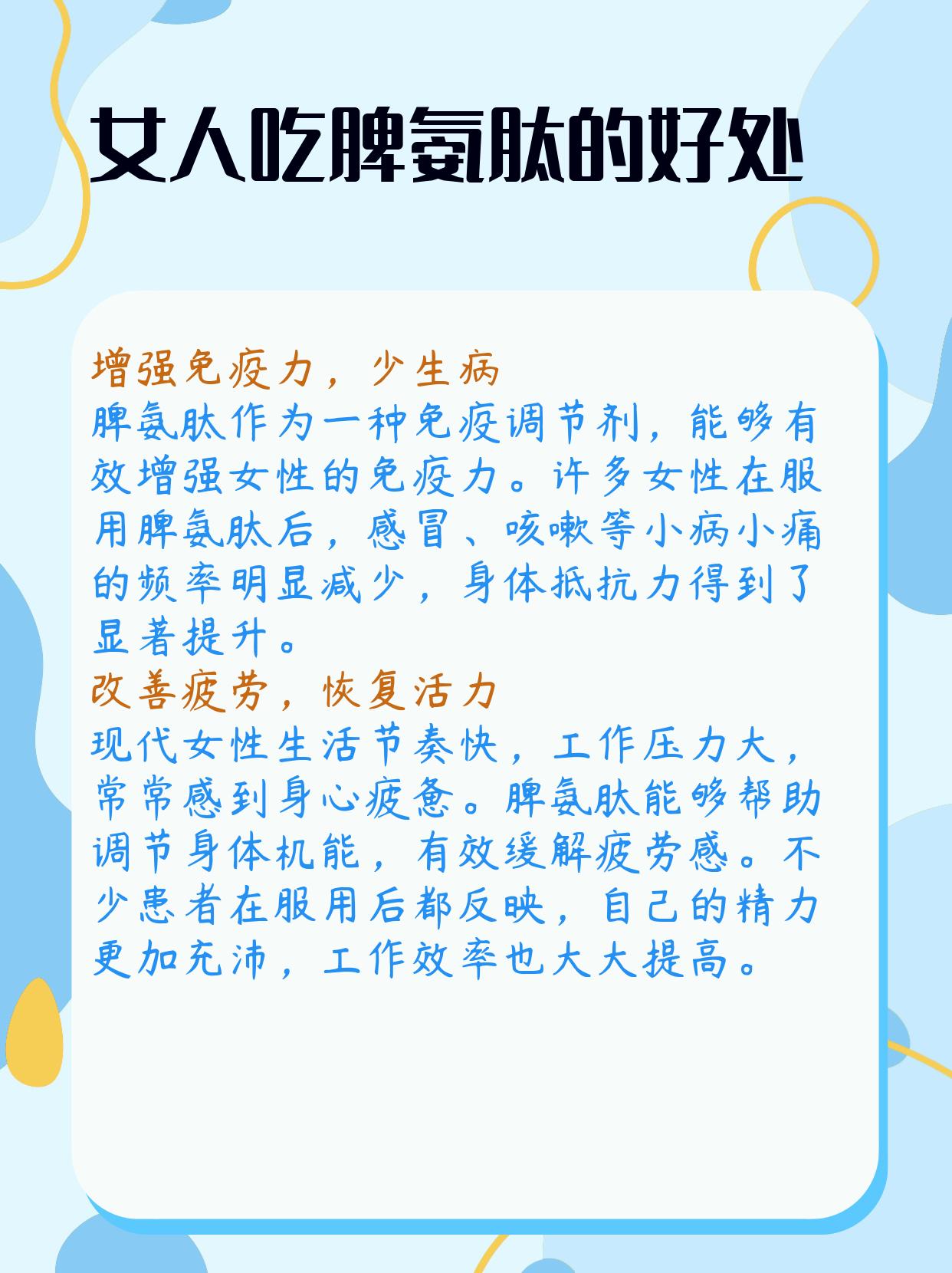 🌟女性吃脾氨肽的好处有增强免疫力,少生病;改善疲劳,恢复活力;促进睡眠,睡得香甜等。